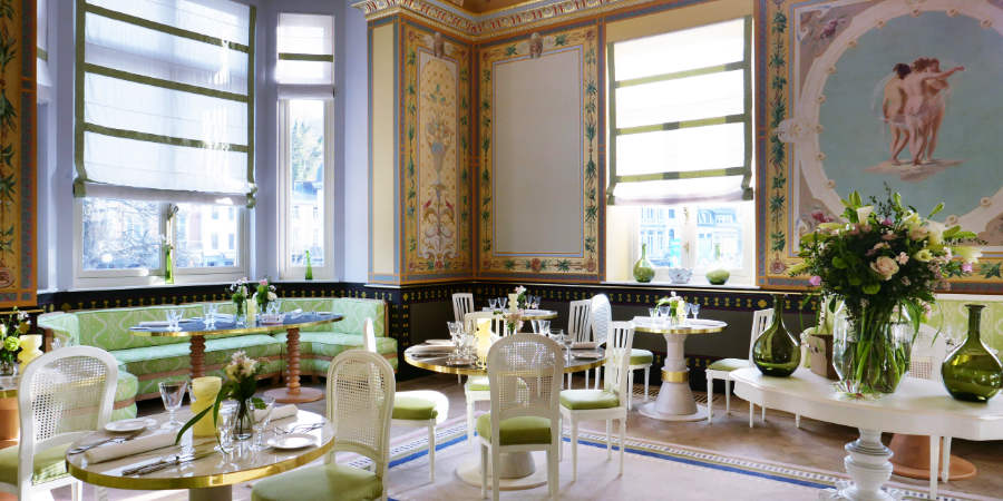 In dit voormalig trefpunt van de Europese elite, krijgen de oude Thermen van Spa nieuw leven in een prachtig herwerkt decor. Als ik de omgeving monster, aanschouw ik met open mond kassetplafonds, mythologische fresco’s, verfijnde vergulde elementen, aquatische sculpturen: de elegantie van weleer vermengt zich met een hedendaagse gevoeligheid en creëert een unieke, intieme en inspirerende sfeer. De kamers en suites, uitgerust met balneobaden of koperen badkuipen, worden luxueuze cocons waarin men zich terugtrekt als in een zachte bubbel. Champagne proeven, chocolaatjes neerleggen, en zich dat zeldzame luxe-moment gunnen: alleen denken aan zichzelf… en aan elkaar.